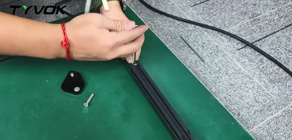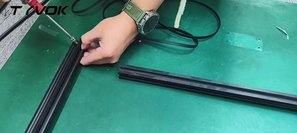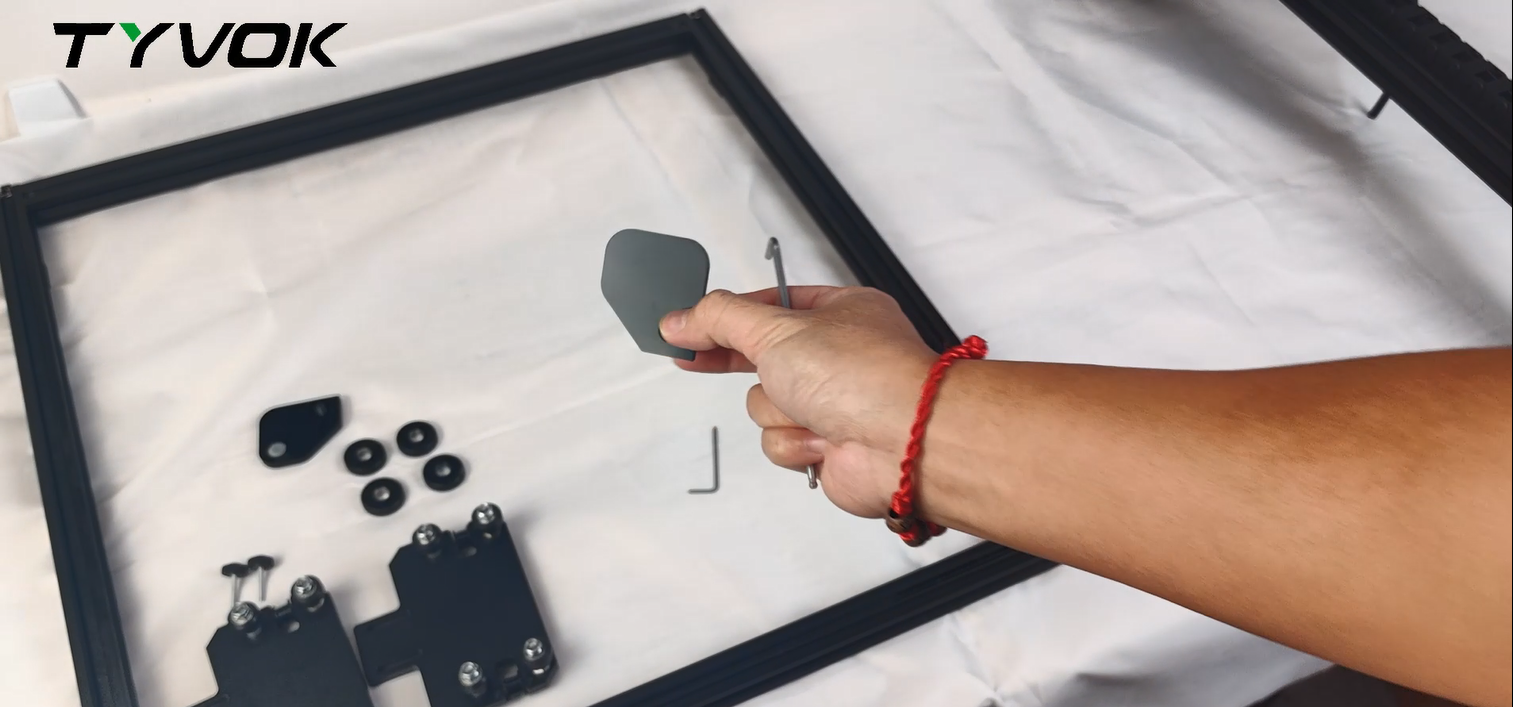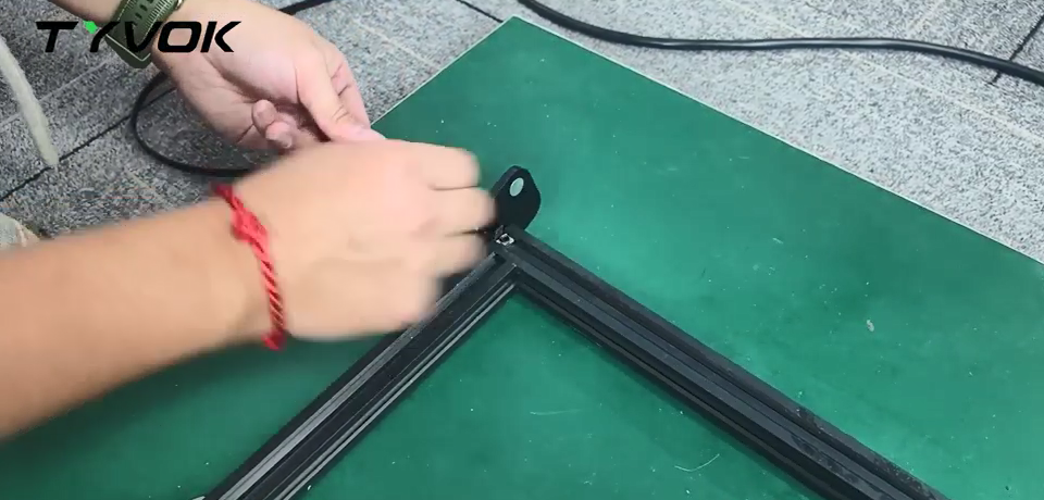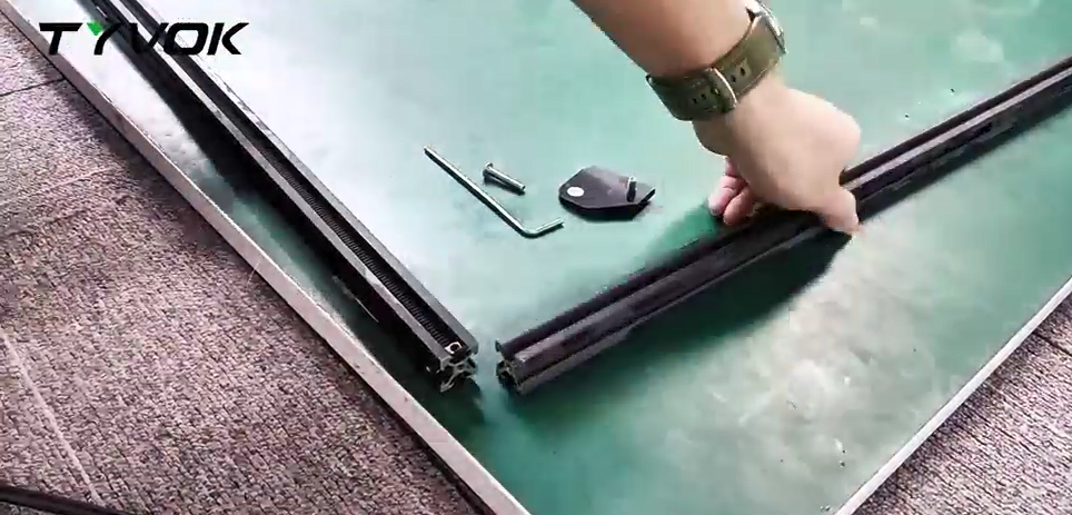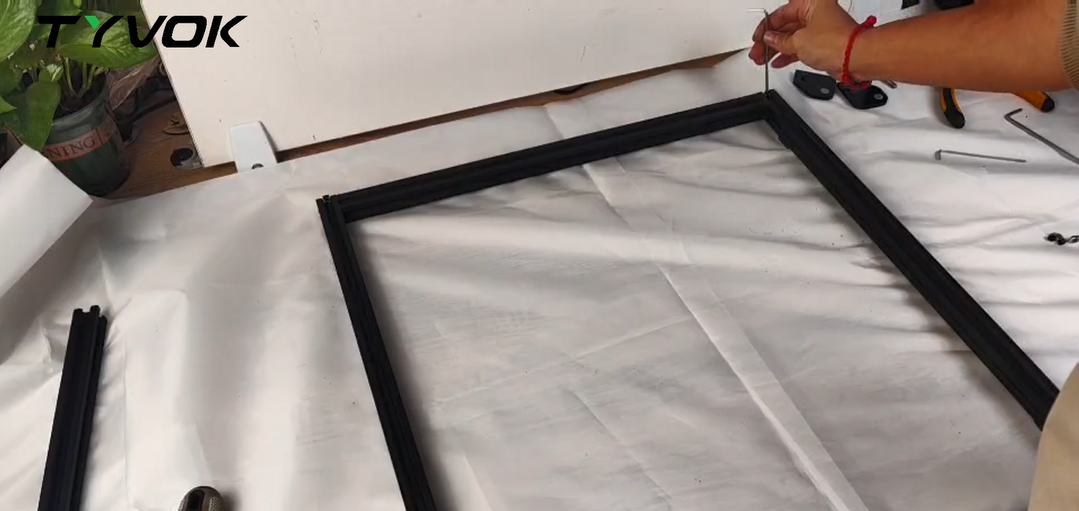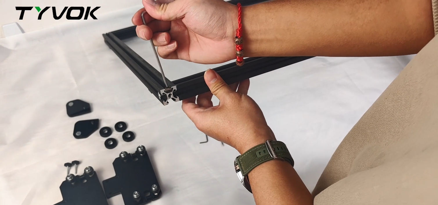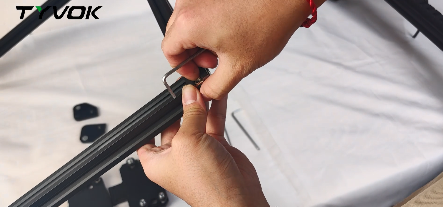¶ 4.3.Take out the M4 hexagonal wrench, loosen and remove the top screws from the fixed strip at the Y-axis connection of the expansion frame (one on each connection), and then take out a fixed strip and install it under the connection of the two profiles (a total of 6 places on the left and right Y-axis)