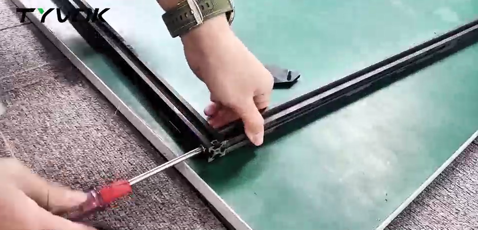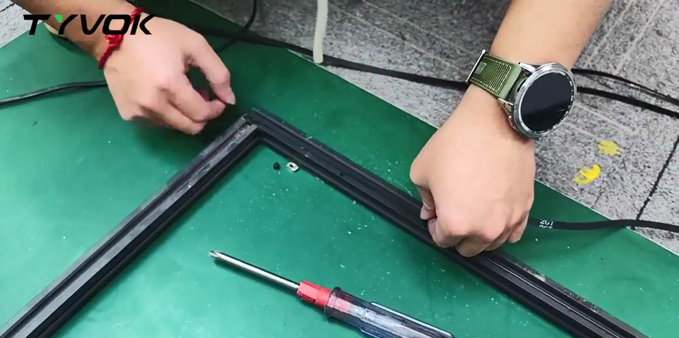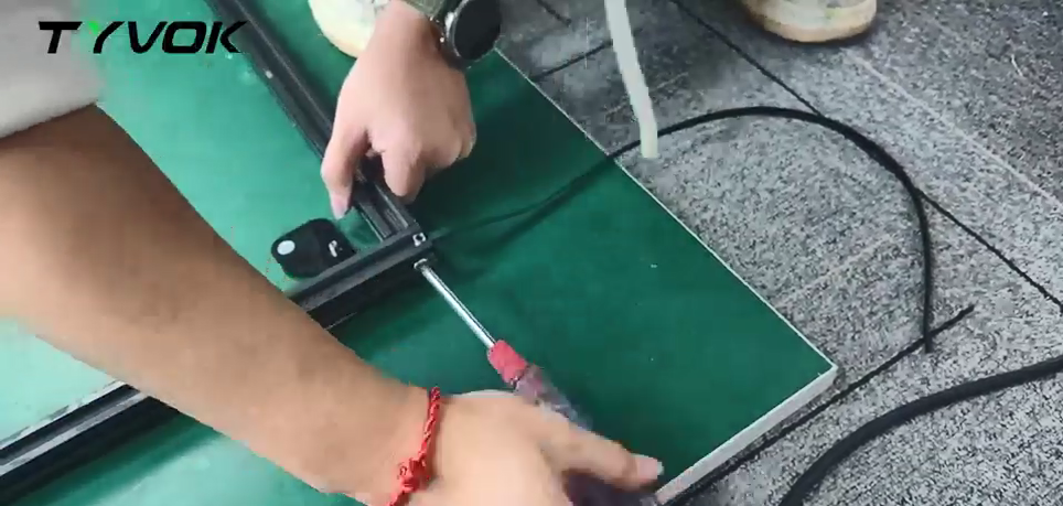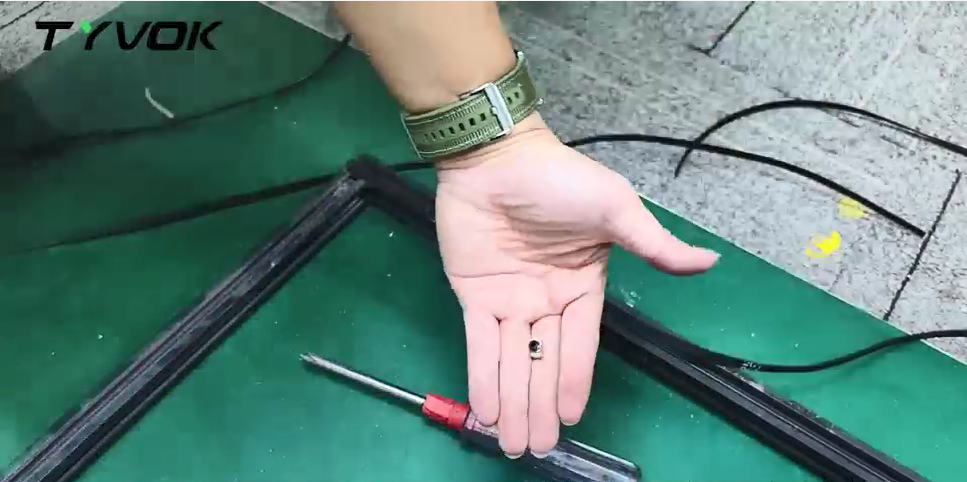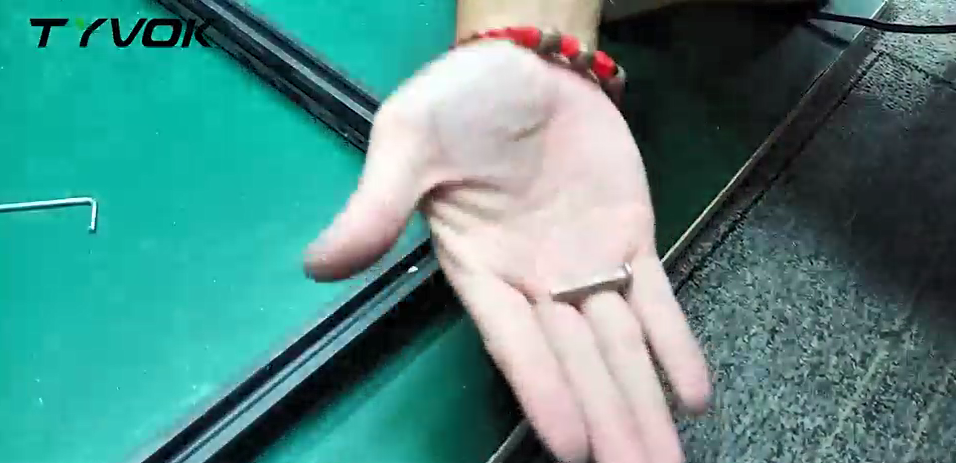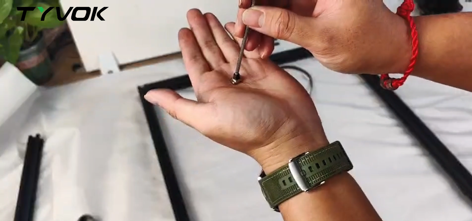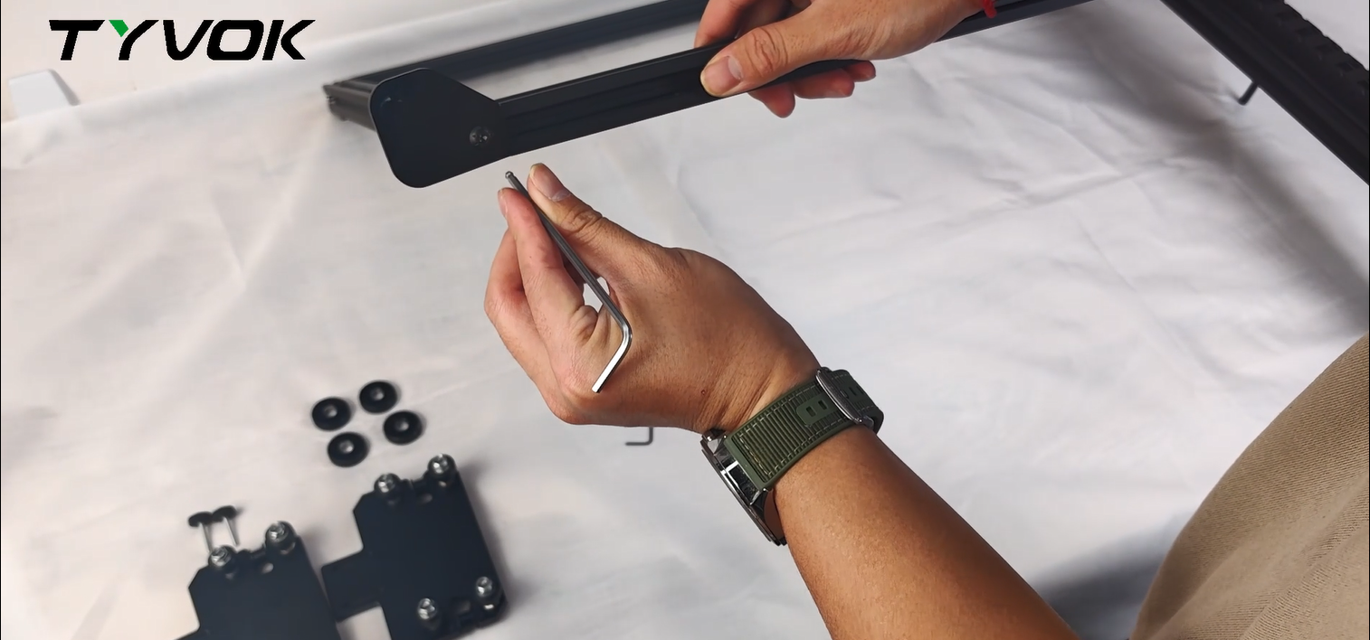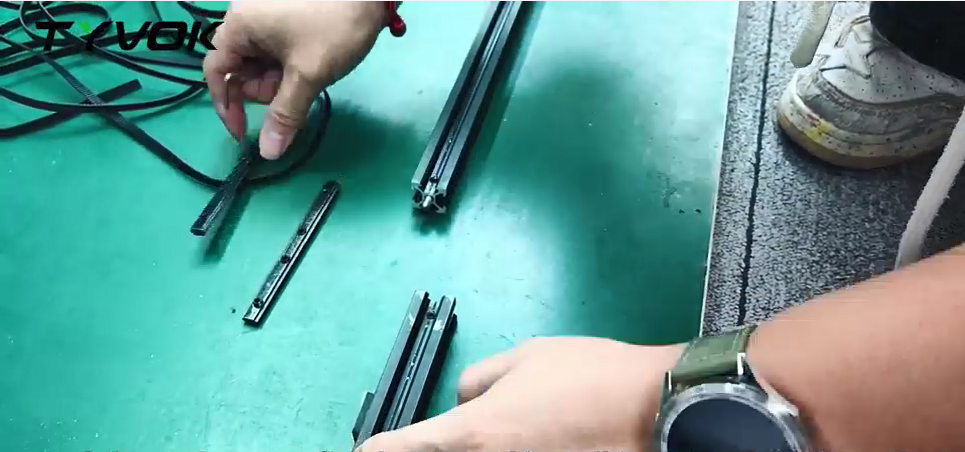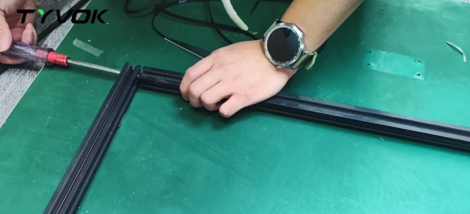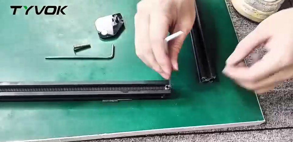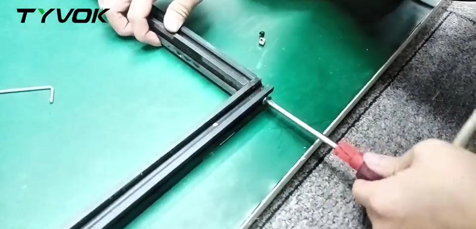 ¶ 4.3.Take out the M4 hexagonal wrench, loosen and remove the top screws from the fixed strip at the Y-axis connection of the expansion frame (one on each connection), and then take out a fixed strip and install it under the connection of the two profiles (a total of 6 places on the left and right Y-axis)
