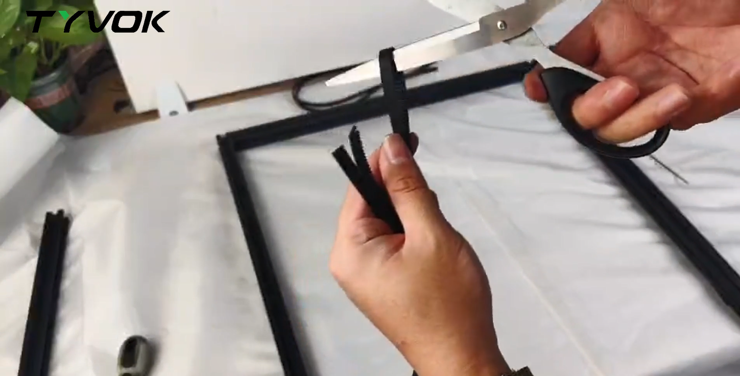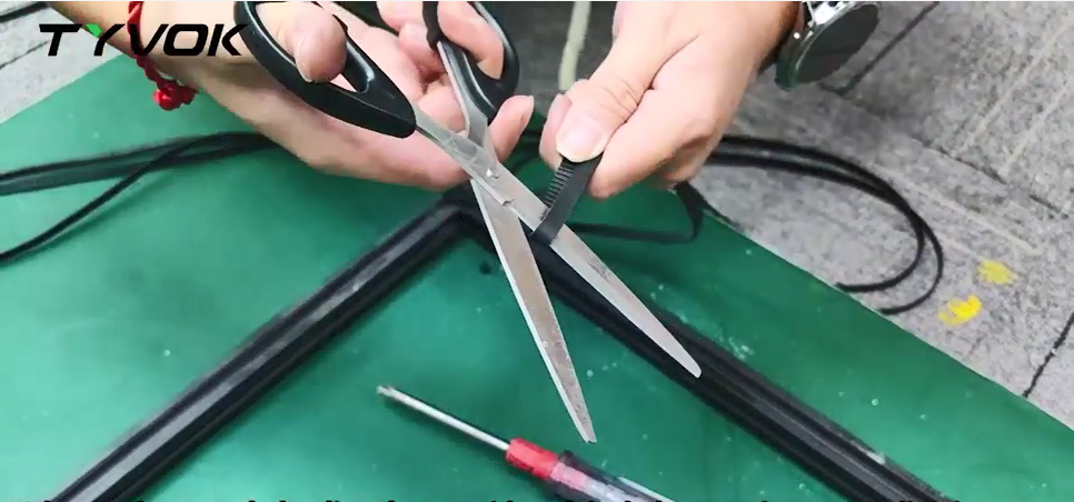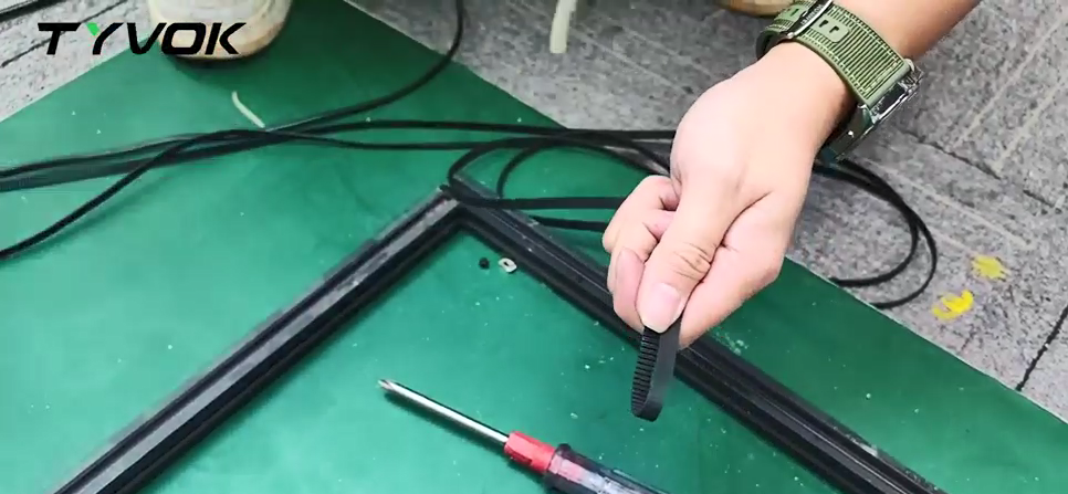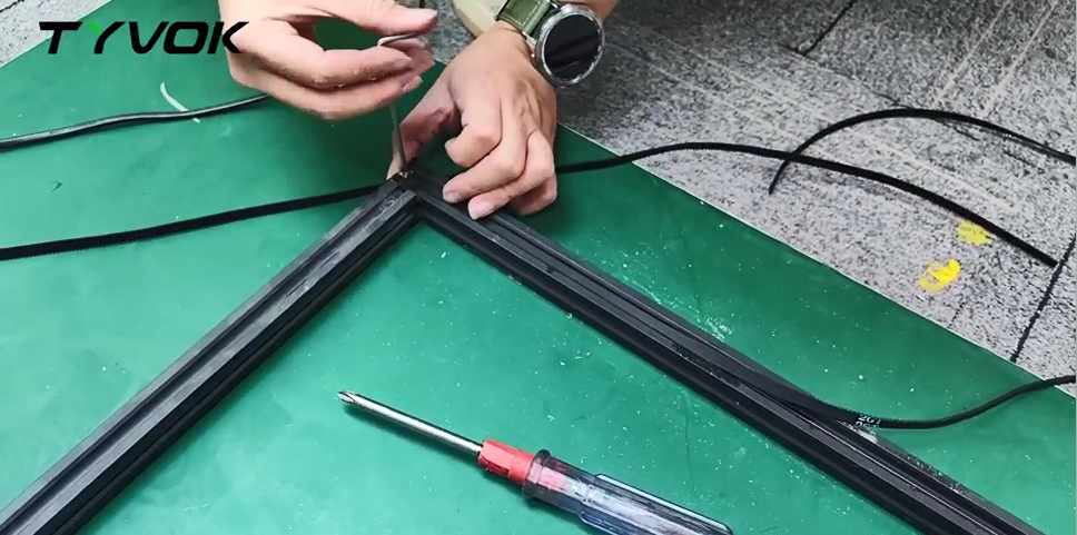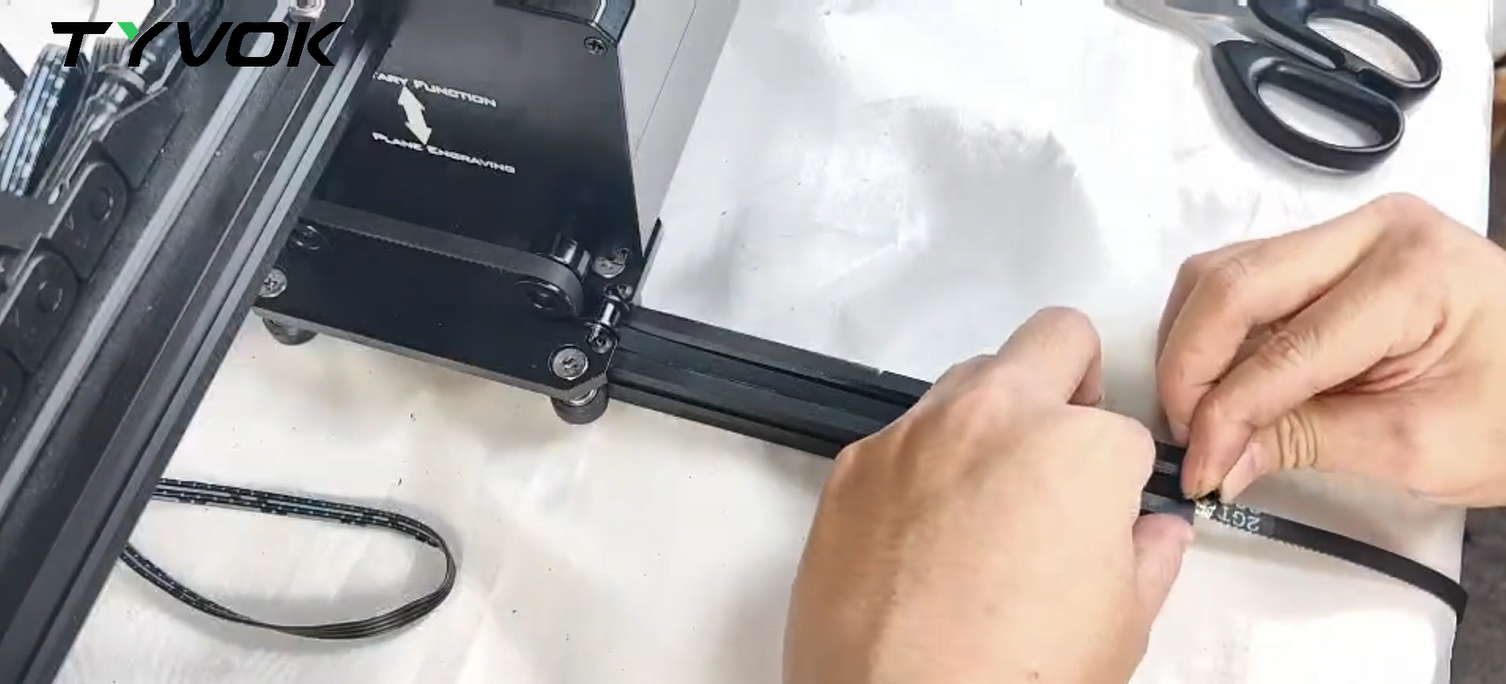 ¶ 5.2.Take out the spare belt, align the two sides of the belt, use scissors to split it into two belts of the same length, and then install the belt with the toothed part facing down.