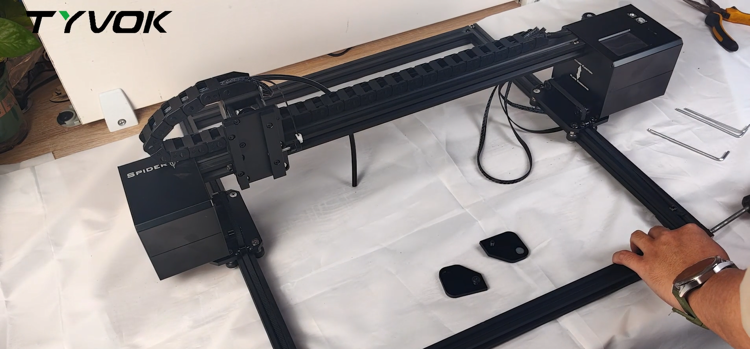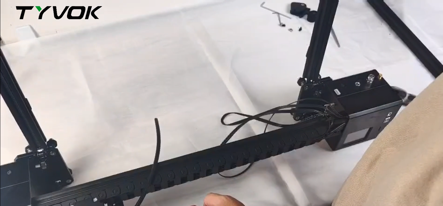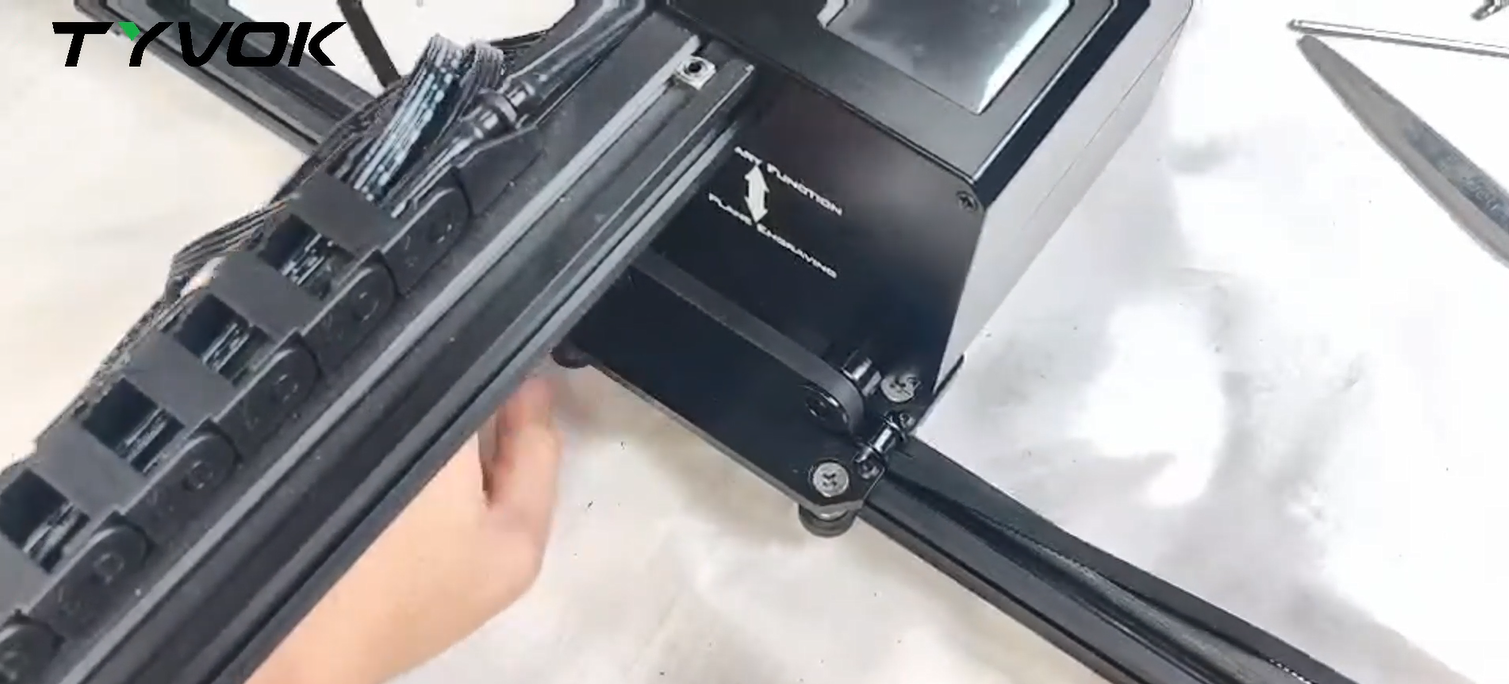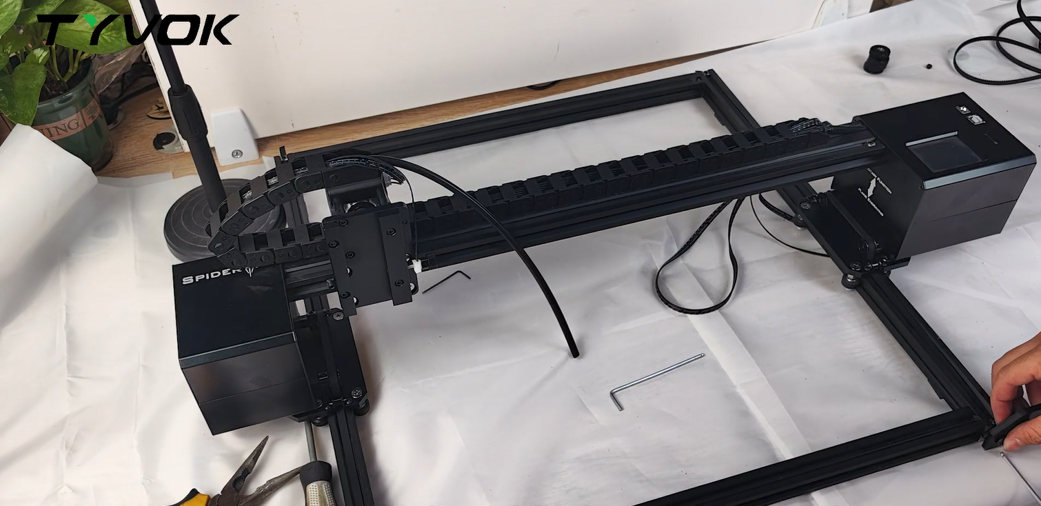 ¶ 6.1.Square the machine and the frame to the left, and then push the machine into the Y axis frame 1/3,reinstall the previously removed X axis frame, fix the frame with a cross screwdriver, and then use M5 hexagonal wrench to install the acrylic limit block back to the frame