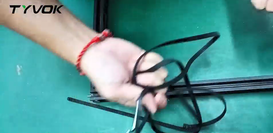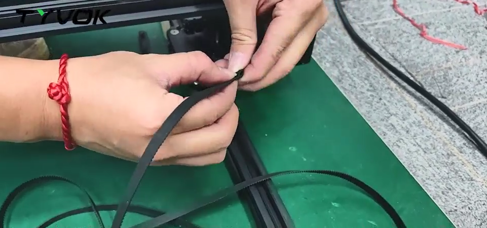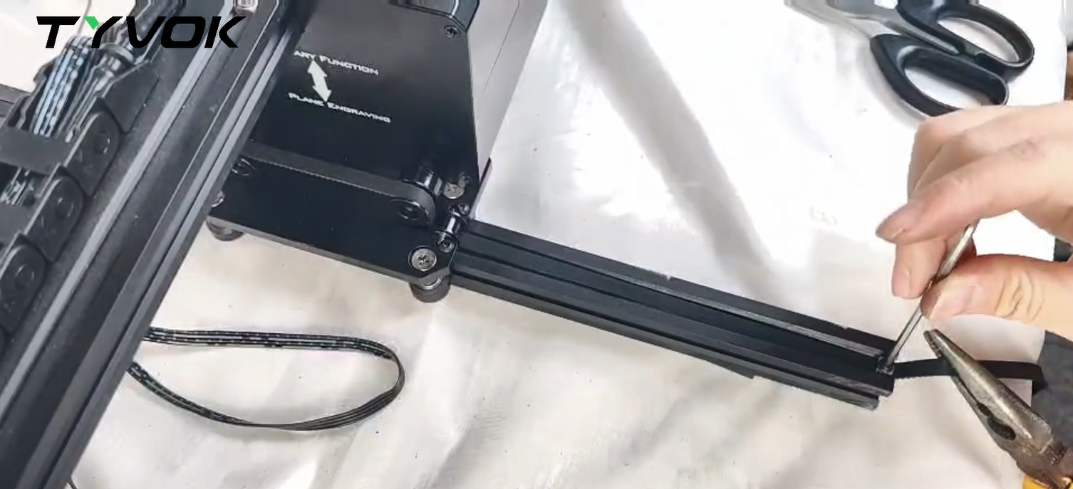 ¶ 5.11.Pre-install the top screw on the belt after installation,use duckbill pliers to tighten the belt, and then use M3 hexagonal wrench to tighten the fixed belt top screw,and use scissors to cut off the excess belt