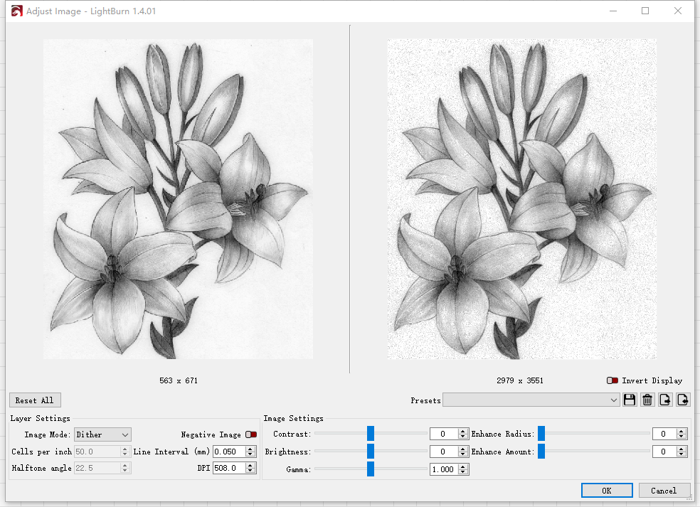 If you want to create works with no brightness and contrast(as in the right image), only black and white, (recommended for processing on harder surfaces, as processing on paper may tear it), please follow these steps: